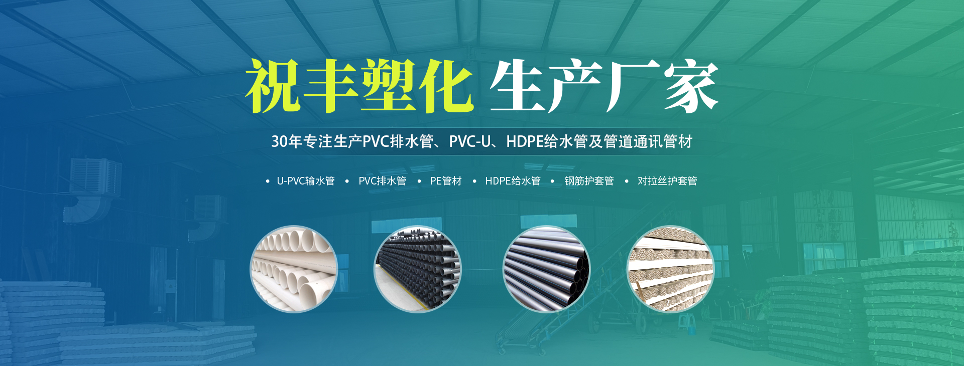 安陽(yáng)市祝豐塑化有限公司坐落在滑縣工業(yè)園區(qū),東臨大廣高速,西臨京珠高速,是鄭州、鶴壁、安陽(yáng)、濮陽(yáng)四個(gè)城市的輸紐,交通便利、環(huán)境優(yōu)美。 公司始建于八十年代,經(jīng)過(guò)二十余年的艱辛創(chuàng)業(yè),規(guī)模不斷壯大,由十多萬(wàn)元資產(chǎn)的小廠,發(fā)展到現(xiàn)占地面積達(dá)一萬(wàn)多平,建筑面積一萬(wàn)平,資產(chǎn)2000多萬(wàn)元管材生產(chǎn)企業(yè)。公司生產(chǎn)PVC-U、PVC排水管、HDPE給水管、鋼筋護(hù)套管管道通訊管材等產(chǎn)品,廣泛用于農(nóng)田節(jié)水、高山引水、人畜用水、建筑、電力通訊等多種用途,品種齊全。為了滿足用戶需求,可承攬各種給水、節(jié)水、灌溉工程。“祝豐塑化”憑借強(qiáng)勁的實(shí)力,優(yōu)良的管理水平。“以質(zhì)量求生存,以信譽(yù)求發(fā)展”的原則全力以赴和大家共同塑造美好未來(lái)。..